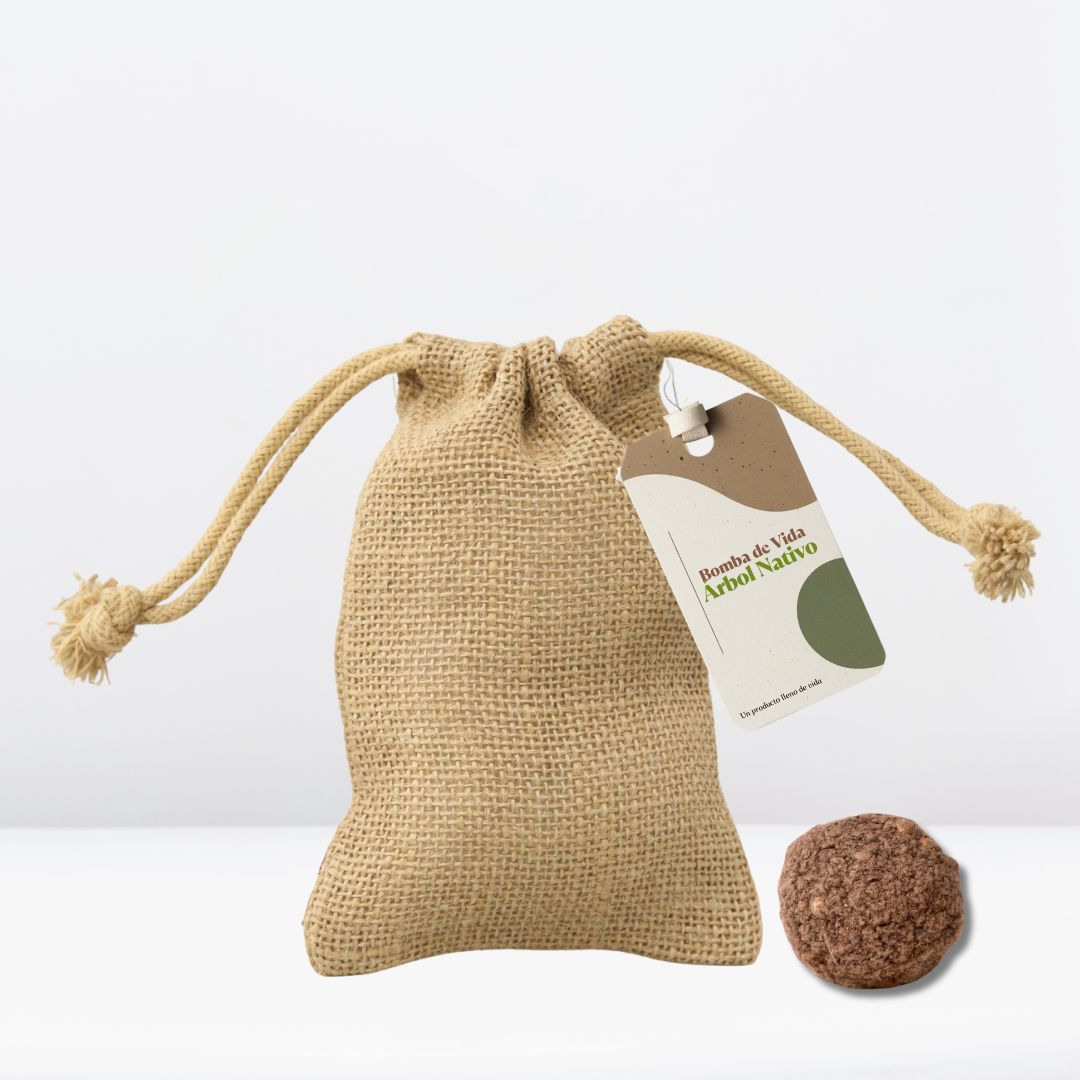 Lleva una bomba de semilla de árbol nativo en un saquito natural de yute, este producto compuesto por 10 kit incluye cada uno una etiqueta plantable 100% personalizada.