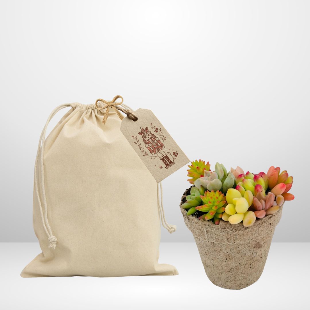 ¡Ya están de vuelta! los bellos jardines plantables montados en macetas de turba vegetal con muchas plantas suculentas mini enraizadas y súper coloridas. Mini jardin incluye saquito de algodón y una etiqueta impresa en papel semilla con diseño de cascanueces.