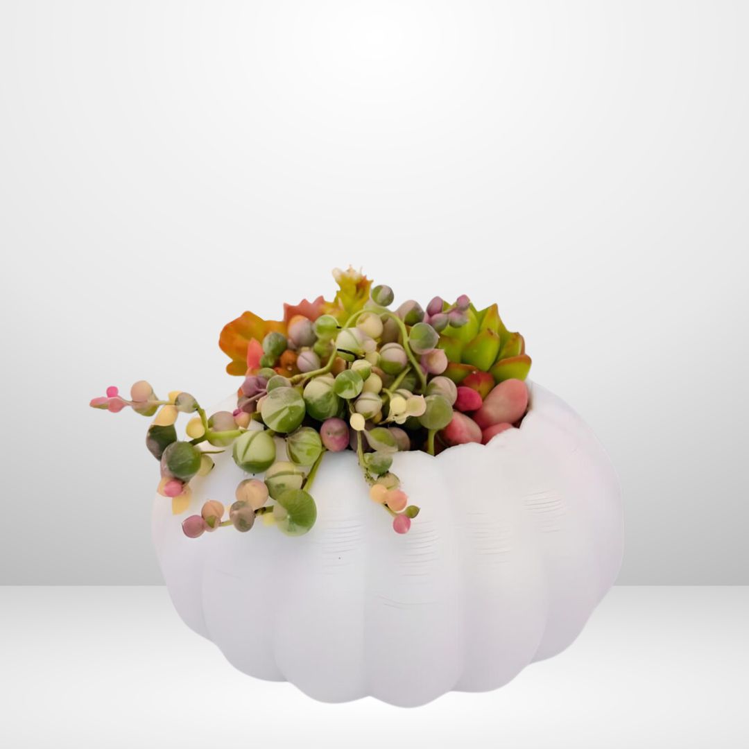 Nuestra maceta en forma de calabaza es una obra de arte hecha con desechos de plantas, reduciendo el impacto ambiental y creando un producto único y respetuoso con la naturaleza.
