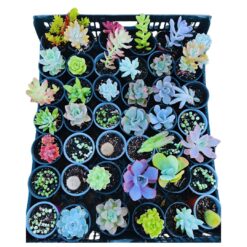 Bandeja con plantas suculentas medianas. Variedades de colección, cactus y senecio variegado.