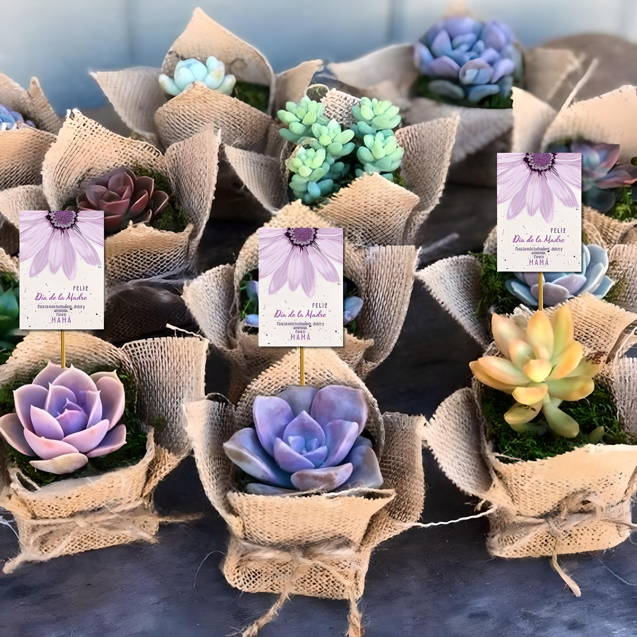 Estas suculentas coloridas de tamaño mediano antes de ser envueltas en arpillera son plantadas en macetas de turba vegetal, como son biodegradables se plantan directamente a la tierra. La arpillera crea el toque perfecto para cualquier celebración donde quieres obsequiar un regalo con sentido. Este pack de 5 suculentas es ideal para regalar. Obsequios incluye una tarjeta plantable personalizada en cada planta.